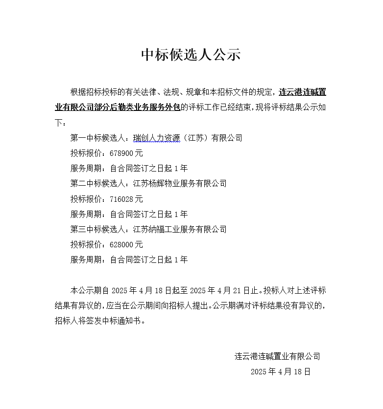 連云港連堿置業(yè)有限公司部分后勤類業(yè)務(wù)服務(wù)外包中標(biāo)候選人公示