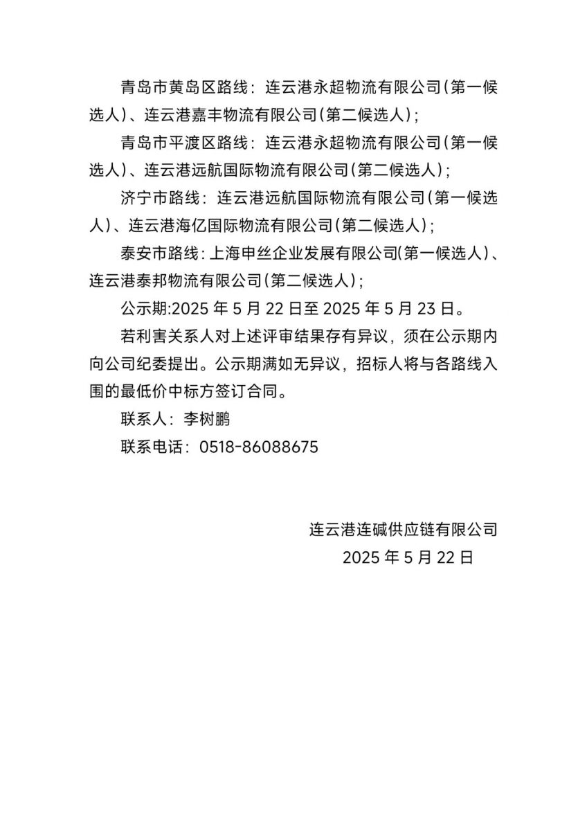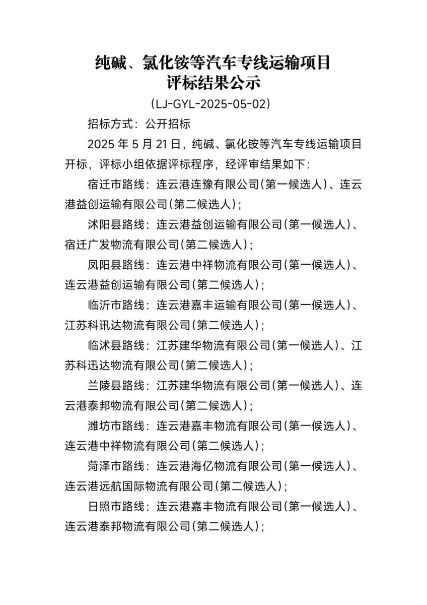 連云港連堿供應(yīng)鏈有限公司純堿、氯化銨等汽車專線運輸項目評標結(jié)果公示
