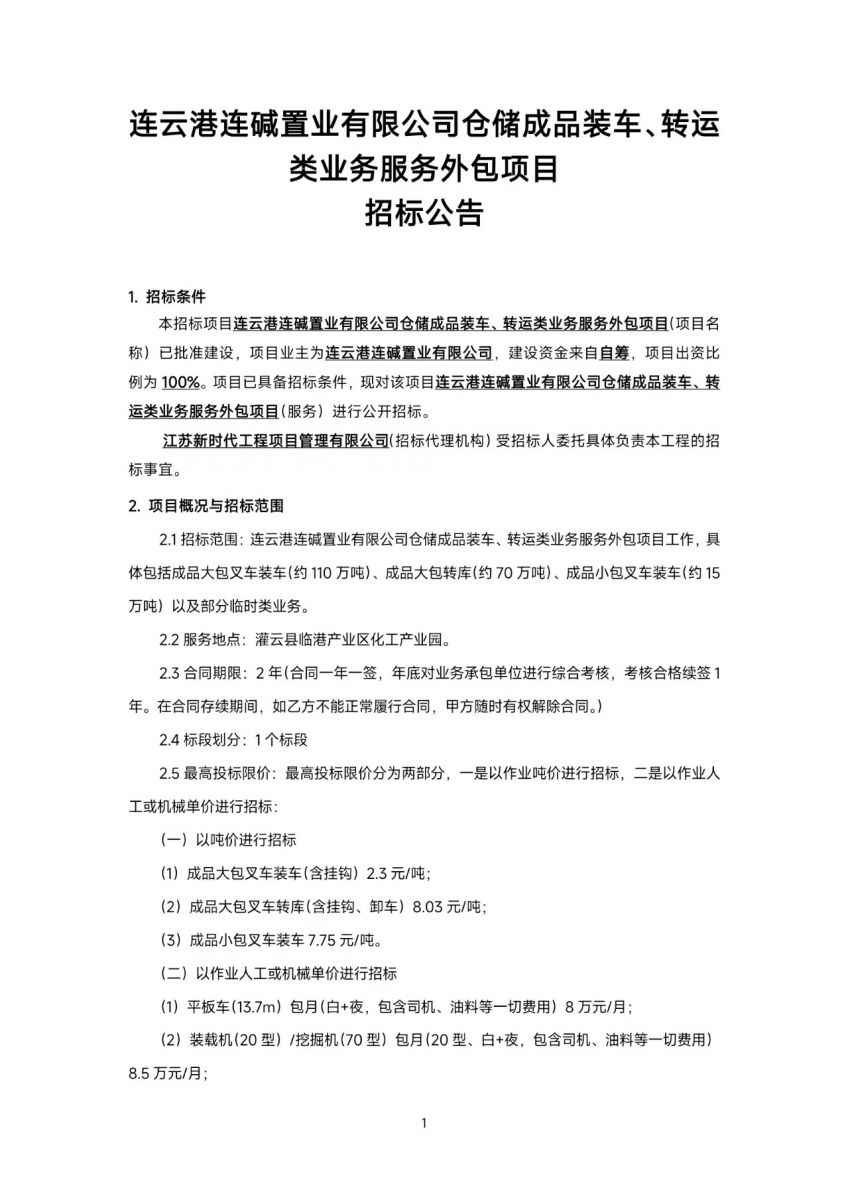 連云港連堿置業(yè)有限公司倉儲成品裝車、轉(zhuǎn)運類業(yè)務服務外包項目招標公告