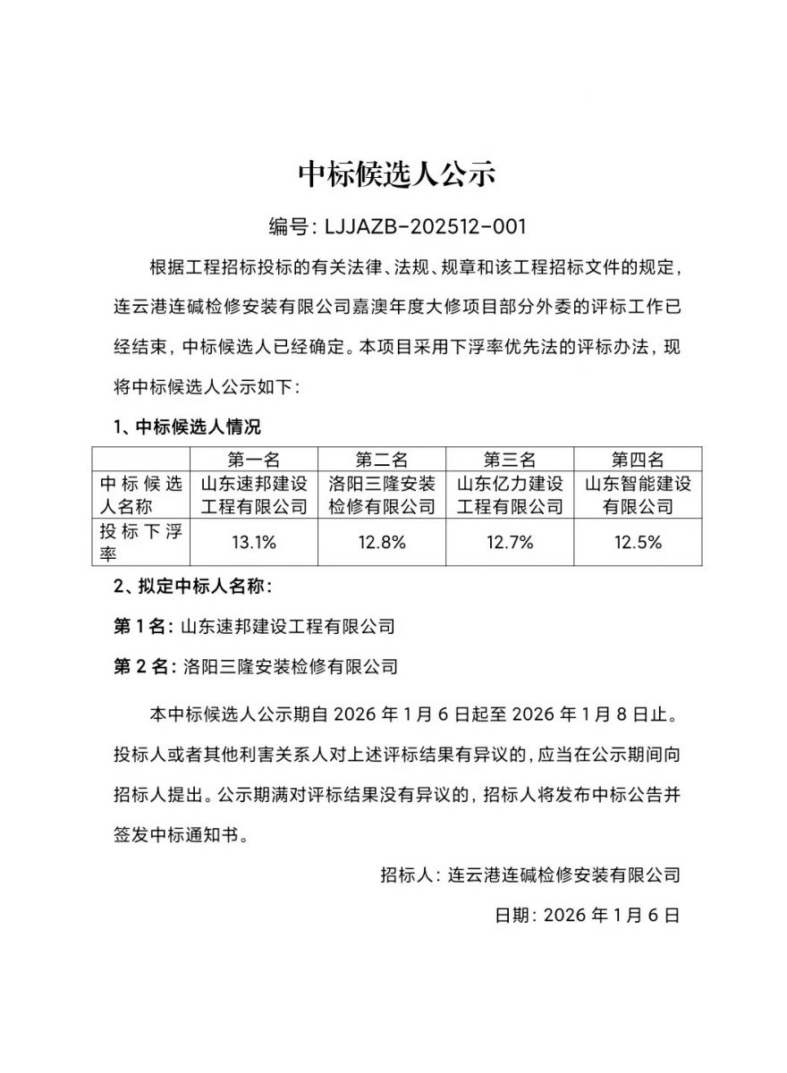連云港連堿檢修安裝有限公司嘉澳年度大修項目中標(biāo)候選人公示