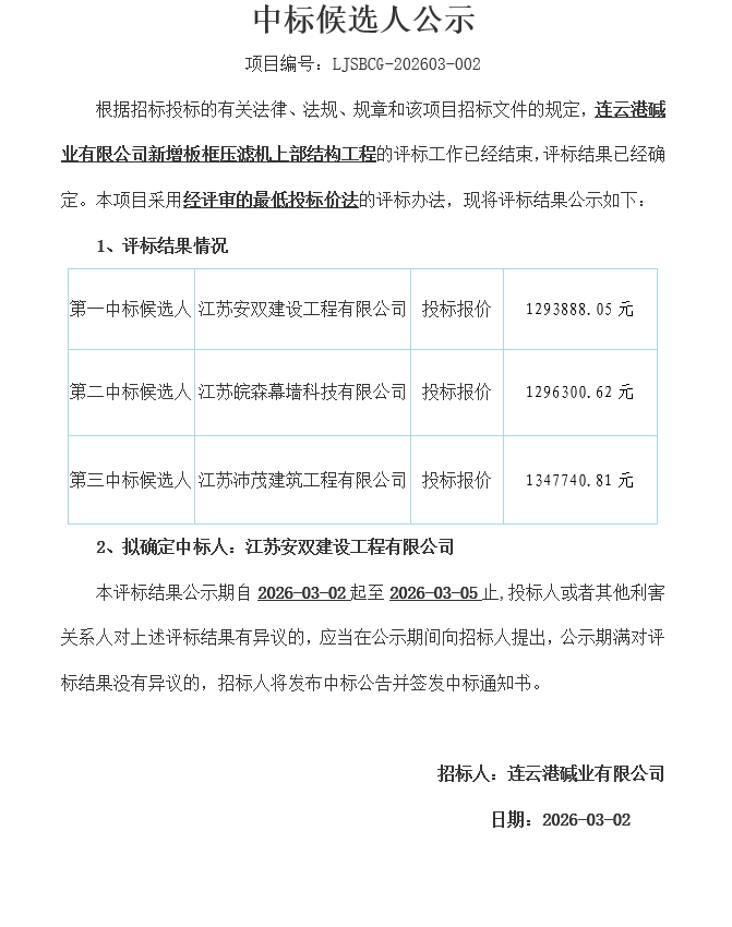 連云港堿業(yè)有限公司新增板框壓濾機(jī)上部結(jié)構(gòu)工程中標(biāo)候選人公示