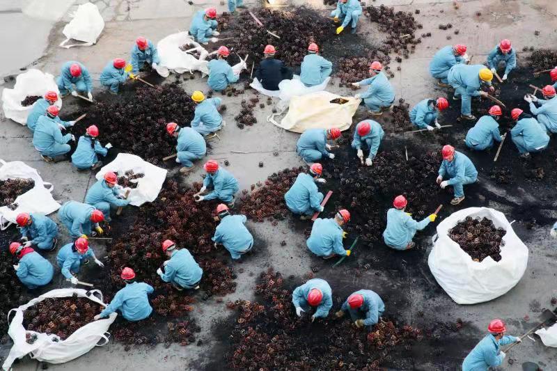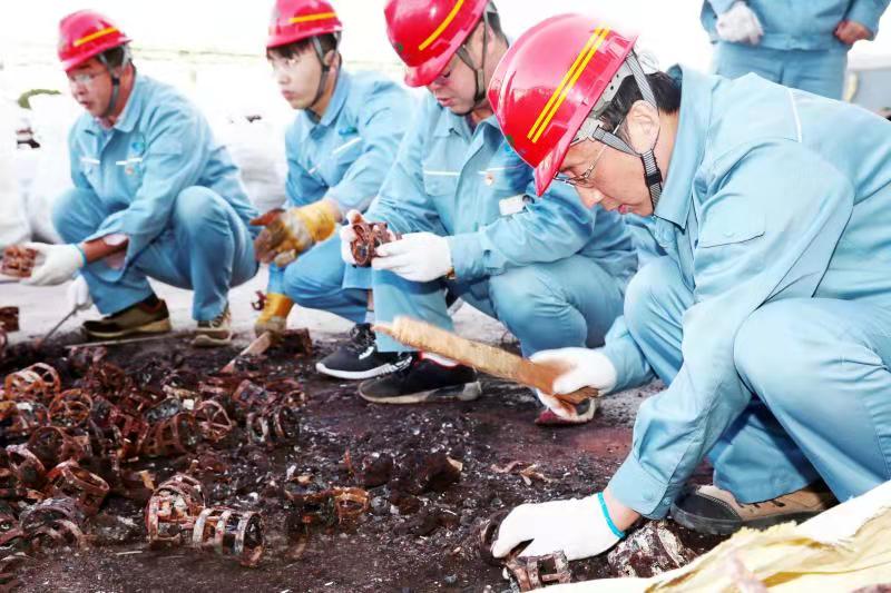 由于清理工作全靠人力完成,崗位人員一邊要維持生產(chǎn),一邊要清理填料,工作量非常大。11月12日下午,公司黨委書記、董事長(zhǎng)張衛(wèi)民在調(diào)研重堿車間生產(chǎn)現(xiàn)場(chǎng)時(shí)了解到這一情況后,當(dāng)機(jī)立斷,立即組織公司領(lǐng)導(dǎo)及各部門黨員干部義務(wù)勞動(dòng),協(xié)助重堿車間完成鮑爾環(huán)填料清理回收工作。