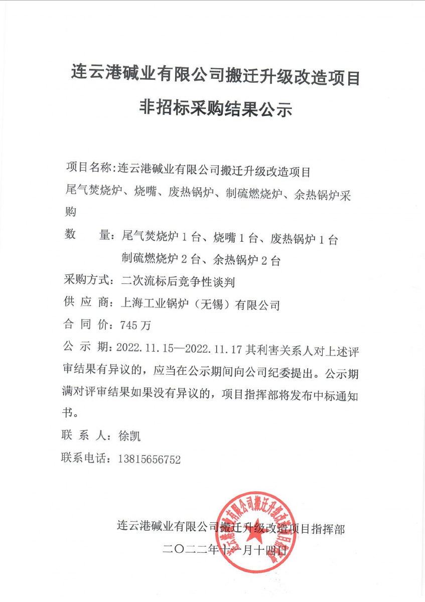 尾氣焚燒爐等設(shè)備非招標(biāo)采購結(jié)果公示