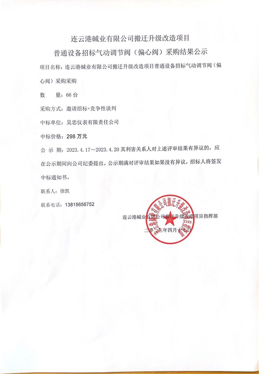 氣動(dòng)調(diào)節(jié)閥(偏心閥)采購結(jié)果公示