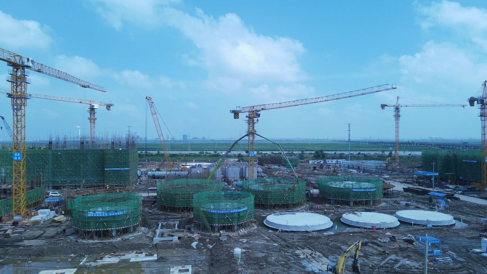 ⑸合成氨二標(biāo)段271原料煤儲運(yùn)破碎樓三層底板放線,#1轉(zhuǎn)運(yùn)站頂層梁板柱澆筑,#2轉(zhuǎn)運(yùn)站三層支撐架搭設(shè),鋼筋綁扎、支模,角撐、斜撐、圍檁安裝;820合成氨循環(huán)水站清凈廢水池上部結(jié)構(gòu),塔下水池墻壁支模;711煤漿制備二層腳手架搭設(shè),鋼筋綁扎,支模,安裝預(yù)埋件,初期雨水池池壁鋼筋綁扎,支模,支撐架搭設(shè),套管安裝;762壓縮機(jī)廠房上部結(jié)構(gòu)支模;761冷箱基礎(chǔ)冷箱防護(hù)墻拆模;膨脹機(jī)房上部結(jié)構(gòu)鋼筋綁扎;712氣化框架立柱腳手架搭設(shè),鋼筋綁扎,基礎(chǔ)承臺鋼筋綁扎,支模,防腐;灌注樁施工;842空分機(jī)柜間鋼筋綁扎;713渣水處理集渣池鋼筋清理,設(shè)備基礎(chǔ)預(yù)埋螺栓安裝。