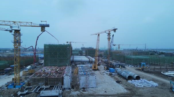 ⑸合成氨二標(biāo)段271原料煤儲(chǔ)運(yùn)破碎樓三層澆筑;#1轉(zhuǎn)運(yùn)站五層腳手架搭設(shè),鋼筋綁扎;#2轉(zhuǎn)運(yùn)站三層腳手架、模板拆除,四層腳手架搭設(shè),鋼筋綁扎,支模;汽車卸煤區(qū),煤筒倉(cāng)外側(cè)土方土方挖取,圍檁安裝;820合成氨循環(huán)水站清凈廢水池鋼板樁拔除;塔下水池1支撐架搭設(shè),鋼筋綁扎;塔下水池2支撐架搭設(shè),對(duì)拉螺栓割除;吸水池1基坑開(kāi)挖準(zhǔn)備;711煤漿制備二層腳手架搭設(shè),梁板柱支模,鋼筋綁扎,埋件安裝;762壓縮機(jī)廠房基礎(chǔ)短柱防腐;剩余設(shè)備基礎(chǔ)鋼筋綁扎,模板支設(shè);763空分后備系統(tǒng)上部結(jié)構(gòu)鋼筋綁扎,預(yù)埋件安裝,支模;764儀表空壓站基礎(chǔ)墻防腐;831空分變電所首層結(jié)構(gòu)鋼筋綁扎,埋件安裝,支模;761冷箱基礎(chǔ)冷箱設(shè)備帶板拼接施工;膨脹機(jī)房上部結(jié)構(gòu)鋼筋綁扎預(yù)埋螺栓安裝;712氣化框架立柱腳手架搭設(shè),鋼筋綁扎;灌注樁施工;樁基大小應(yīng)變檢測(cè);基坑開(kāi)挖準(zhǔn)備;塔吊附近承臺(tái)基坑回填;842空分機(jī)柜間板墻鋼筋綁扎;713渣水處理集渣池支撐架搭設(shè),鋼筋綁扎,支模;設(shè)備基礎(chǔ)錨固鋼筋焊接。