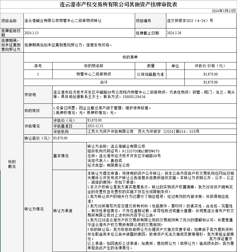 連云港堿業(yè)有限公司物管中心二級庫物資轉(zhuǎn)讓公告