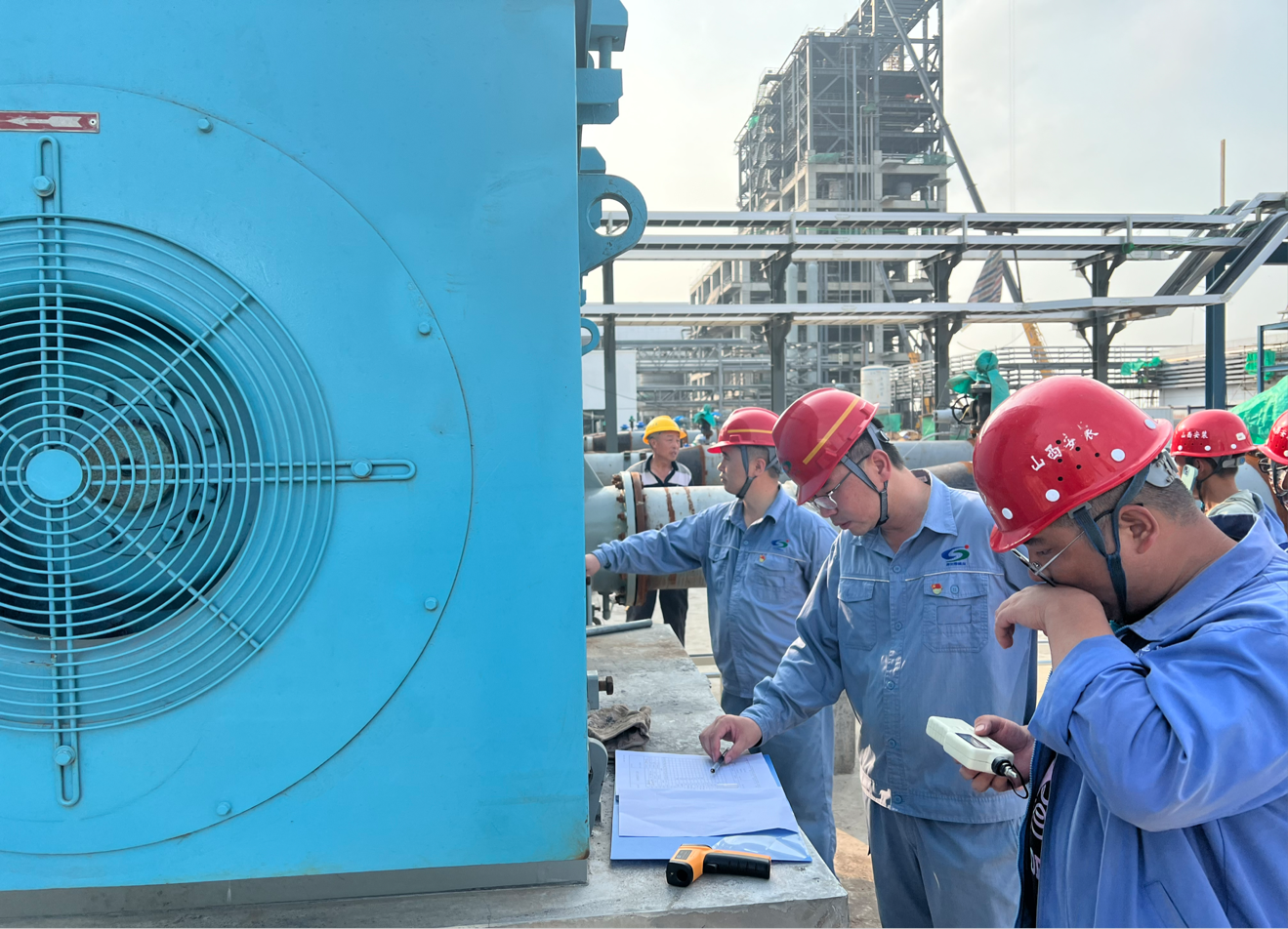 上午11:28,伴隨著“具備條件,啟動電機”指令的發(fā)出,操作人員按下空分循環(huán)水泵P820101A“啟動”開關(guān),電機開始高速旋轉(zhuǎn),隨后操作人員依次開啟P820101B、C??辗盅h(huán)水泵單機試車的現(xiàn)場“熱辣滾燙”,大家衣衫被汗水濕透,但熱情依舊高漲。操作人員每隔15分鐘就詳細檢查記錄電機的軸溫、轉(zhuǎn)速、振值等指標。