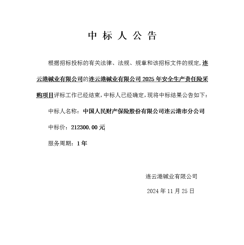 連云港堿業(yè)有限公司2025年安全生產(chǎn)責(zé)任險采購項目中標(biāo)人公告