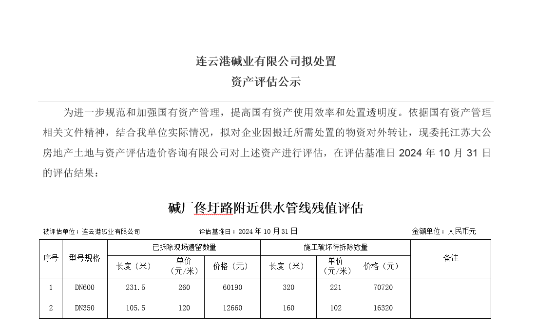 連云港堿業(yè)有限公司佟圩路附近供水管線資產(chǎn)評估公示